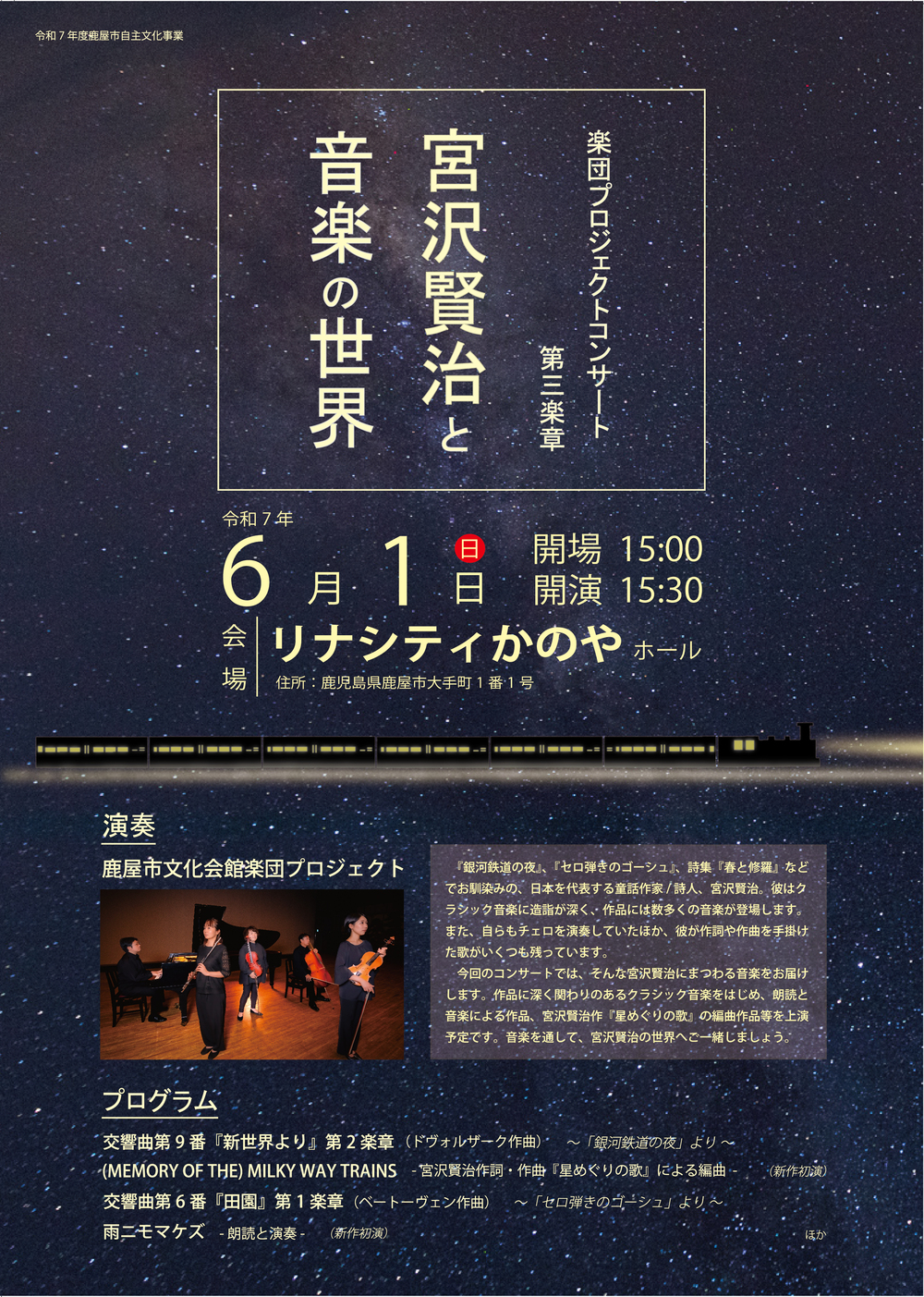 クラシック音楽に造詣が深く、自らもチェロの演奏や作詞作曲を行った宮沢賢治。今回のコンサートでは、宮沢賢治にまつわる音楽をお届けします。作品に登場するクラシック音楽はもちろん、宮沢賢治作「星めぐりの歌」の編曲作品、音楽に合わせた詩の朗読など、楽団プロジェクトオリジナルの新作も演奏予定です。お客様と一緒に、音楽を通して宮沢賢治の世界を楽しむことができましたら幸いです。