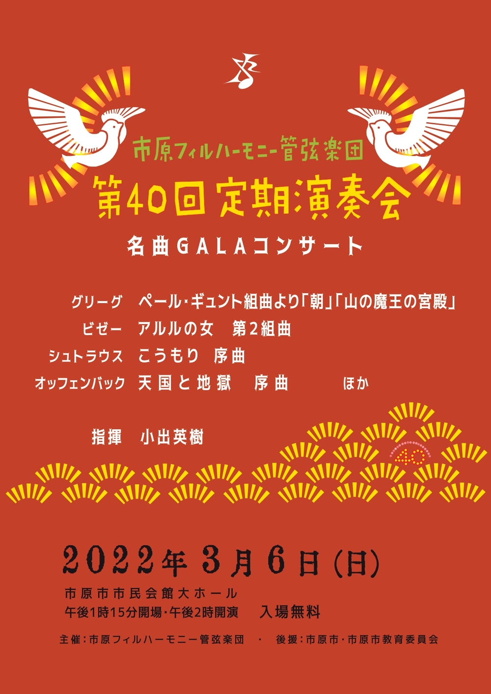 市原フィルハーモニー管弦楽団は、結成30周年、そして第40回となる定期演奏会を記念し、クラシックに詳しくない方でも一度は耳にしたことがある名曲を集めたガラコンサートを実施いたします。ぜひお越しくださいませ。