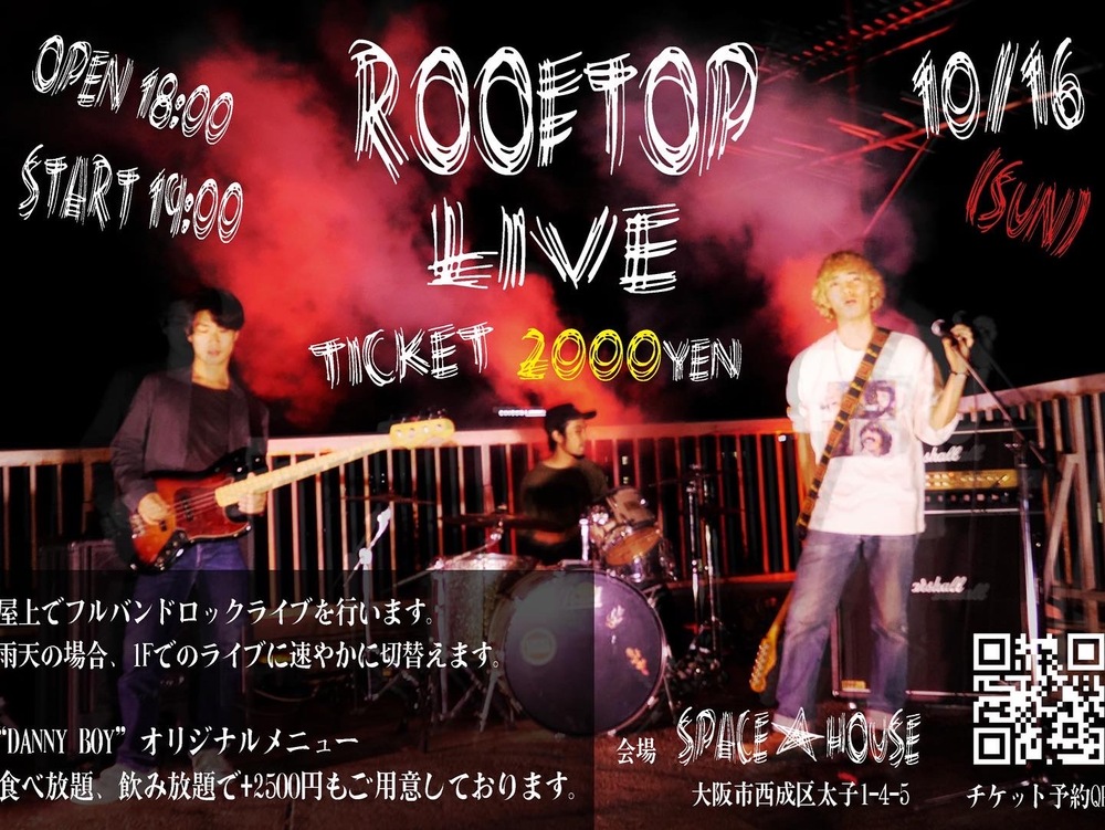 スペースハウス屋上でビートルズのRooftop Concertの様に生バンドロックライブを行います。雨天の場合、速やかに1Fでのライブに切り替えます。