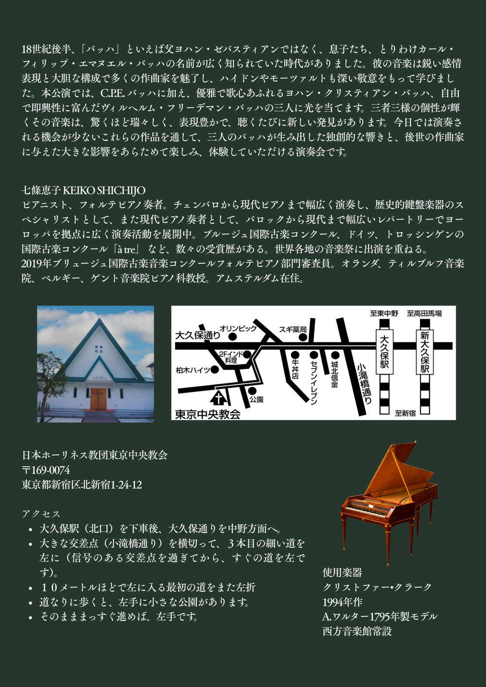 18世紀後半、「バッハ」といえば父ヨハン・ゼバスティアンではなく、息子たち、とりわけカール・フィリップ・エマヌエル・バッハの名前が広く知られていた時代がありました。彼の音楽は鋭い感情表現と大胆な構成で多くの作曲家を魅了し、ハイドンやモーツァルトも深い敬意をもって学びました。本公演では、C.P.E. バッハに加え、ヨハン・クリスティアン・バッハ、ヴィルヘルム・フリーデマン・バッハの三人に光を当てます。自由で即興性や、優雅な歌心といった三者三様の個性が輝くその音楽は、驚くほど瑞々しく、表現豊かで、聴くたびに新しい発見があります。今日では演奏される機会が少ないこれらの作品を通して、三人のバッハが生み出した独創的な響きと、後世の作曲家に与えた大きな影響をあらためて楽しみ、体験していただける演奏会です。(七條恵子)
