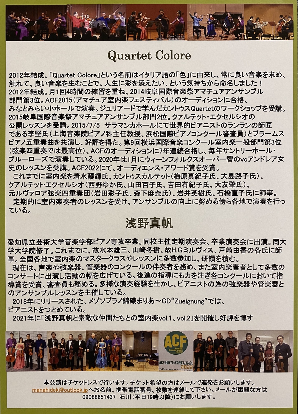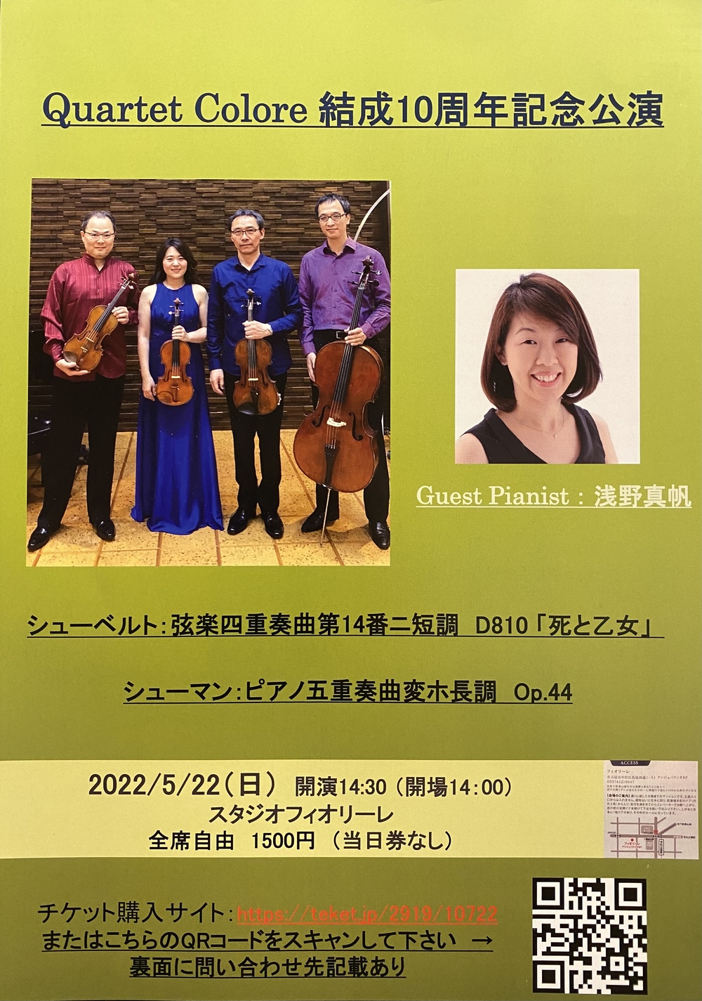 Quartet Colore は2012年結成、今年が10周年となります。結成10周年記念公演を開催するにあたり、愛知県芸卒、東海地方で室内楽を中心にご活躍中の浅野真帆さんをゲストピアニストとしてお招きします。伴奏者、教育者、コンクール審査員等もマルチでこなすピアニストと第9回横浜国際音楽コンクール室内楽一般部門第3位(弦楽四重奏では最高位)、サントリーホール•ブルーローズで開催されたACF2022でオーディエンス•アワード賞を受賞したQuartet Coloreとの共演で、聴きごたえのある名曲シューベルト、シューマンがどのような響きとなるかが聴きどころです。