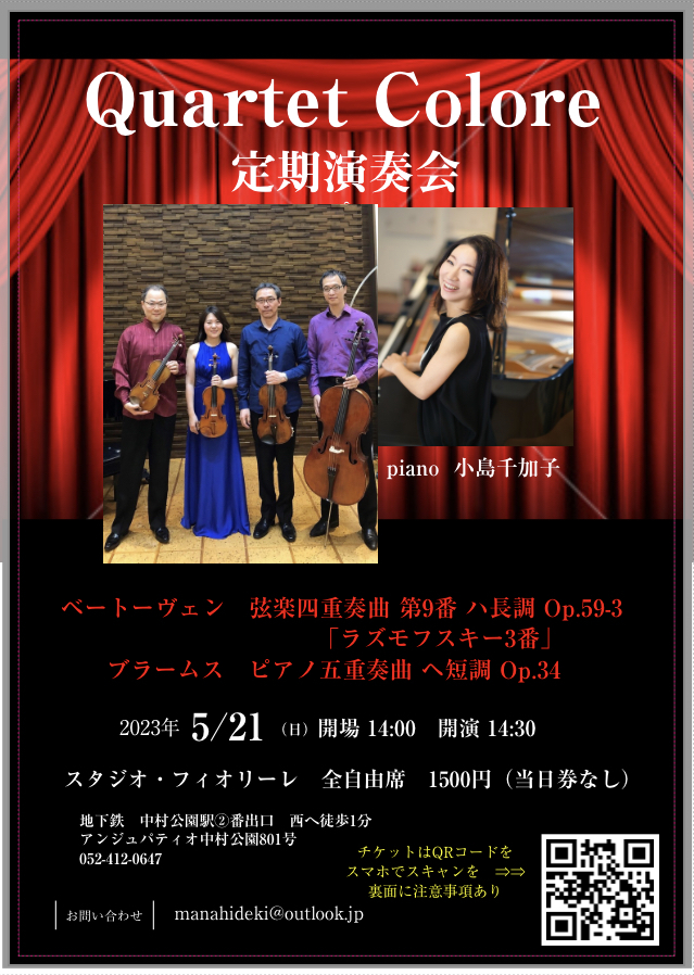 昨年のQuartet Colore結成10周年記念公演は60席チケット完売しました。今回は室内楽奏者として御活躍のピアニスト小島千加子氏をお迎えして、ブラームス ピアノ五重奏曲を演奏します。