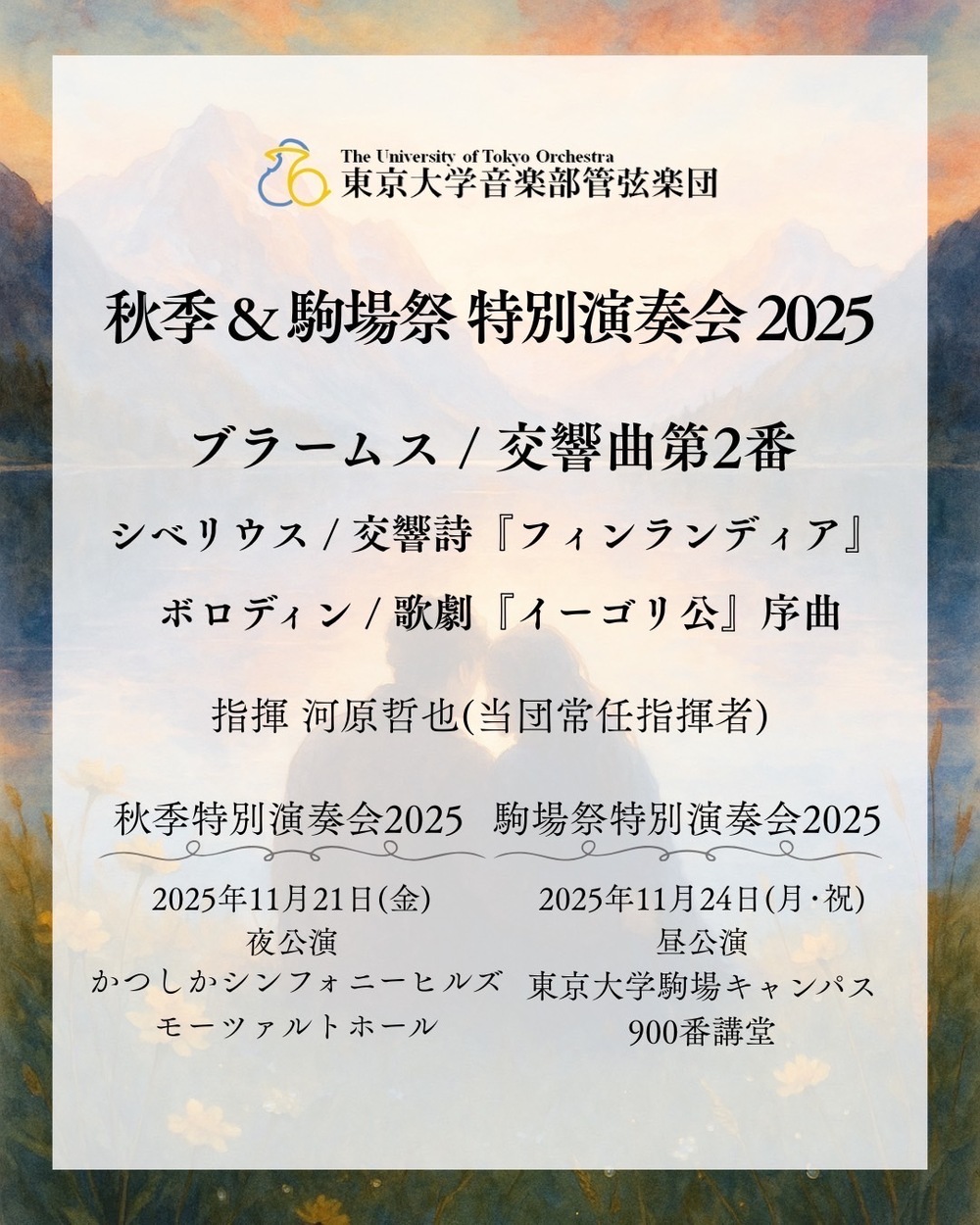 今回の演奏会では、100年以上の歴史を誇るアマチュアオーケストラ「東京大学音楽部管弦楽団」より、1・2年生を中心とする「駒場オケ」が演奏を行います。