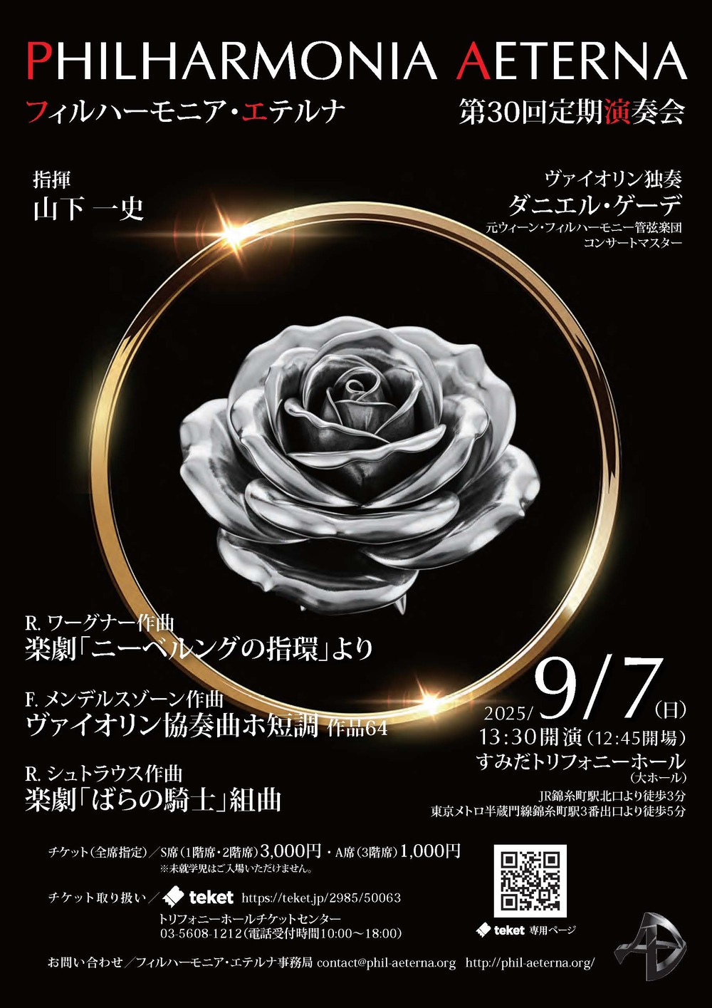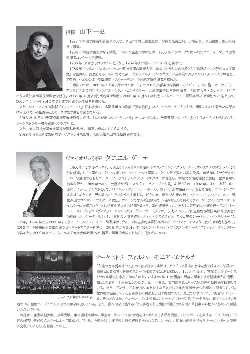 ダニエル・ゲーデ氏(元ウィーン・フィルハーモニー管弦楽団コンサートマスター)をソリストに迎え、F.メンデルスゾーンのヴァイオリン協奏曲を取り上げるとともに、R.ワーグナーの楽劇「ニーベルングの指環」より抜粋と、R.シュトラウスの歌劇「ばらの騎士」組曲を演奏いたします。