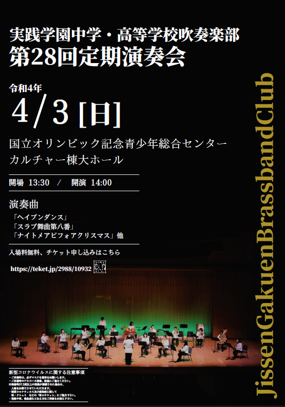 実践学園学園高校吹奏楽部は3月24日(月)第31回定期演奏会を行います。入場無料です。19時開演。