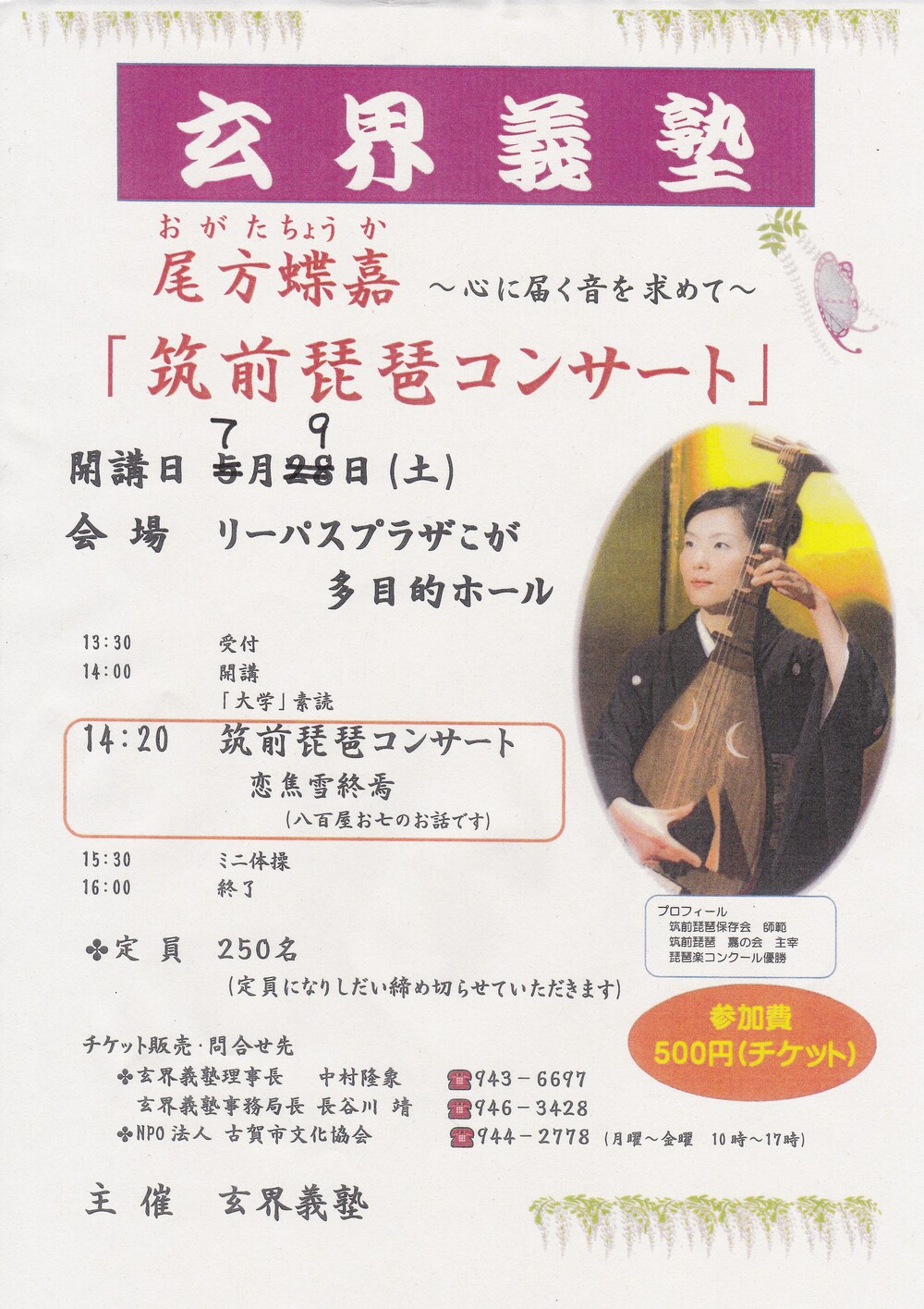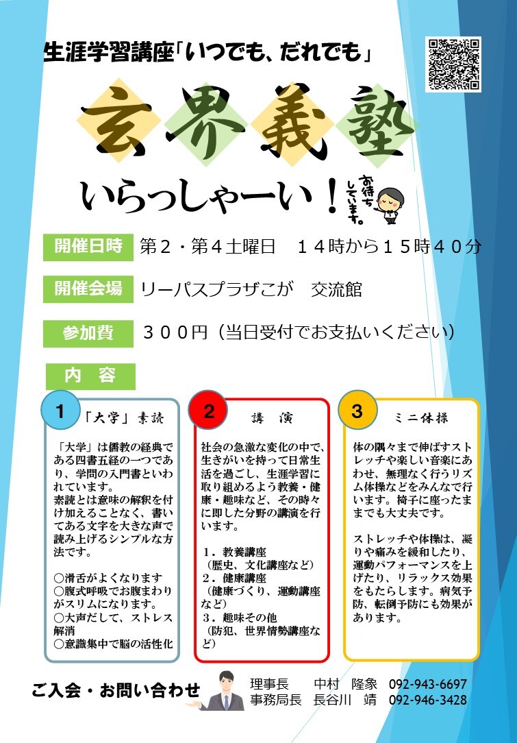 開講は、原則として毎月第2、第4土曜日です。いづれも14時~15時40分の100分間で、開催場所は古賀市中央公民館。内容は、大学の素読、1時間の講話、ミニ体操の…