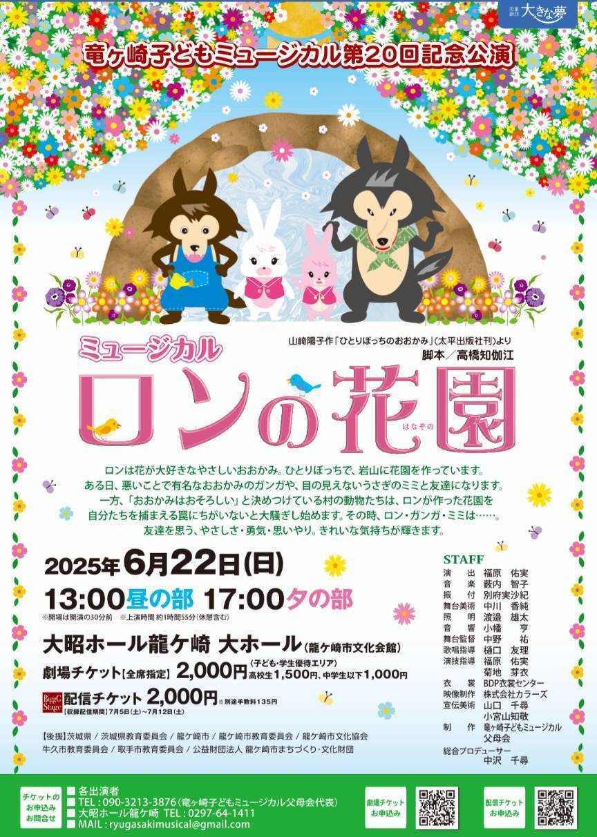 ロンは花が大好きなやさしいおおかみ。ひとりぼっちで、岩山に花園を作っています。ある日、悪いことで有名なおおかみのガンガや、目の見えないうさぎのミミと友達になります。一方「おおかみはおそろしい」と決めつけている村の動物たちは、ロンが作った花園を自分たちを捕まえる罠に違いないと大騒ぎし始めます。その時、ロン・ガンガ・ミミは・・・。友達を思う、やさしさ・勇気・思いやり。きれいな気持ちが輝きます。