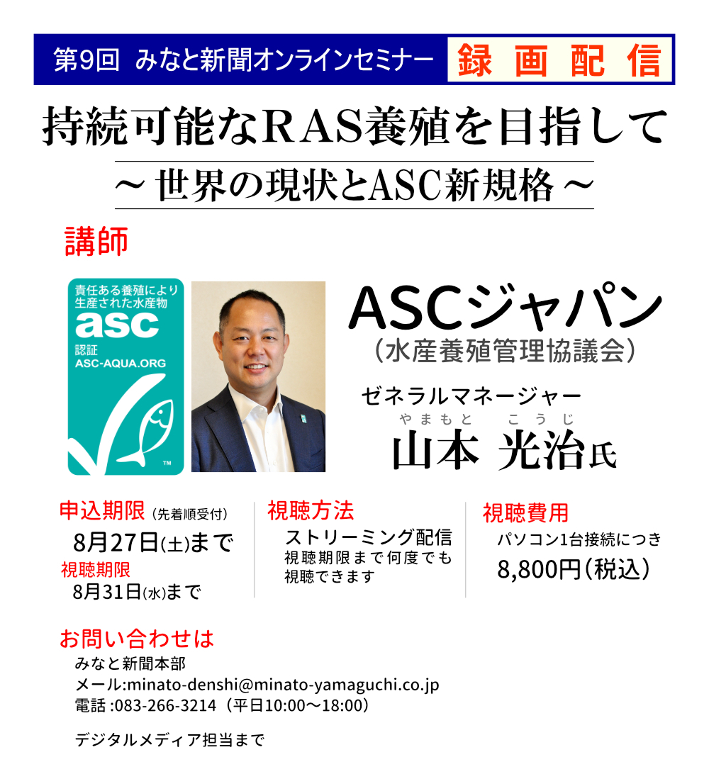 テーマは「持続可能なRAS養殖を目指して~世界の現状とASCの新規格」。水産養殖管理協議会(ASC)がこのほど新設した水産養殖エコラベルのRAS専用規格について、ASCジャパンの山本光治ゼネラルマネージャーにZoomでお話しいただきました。