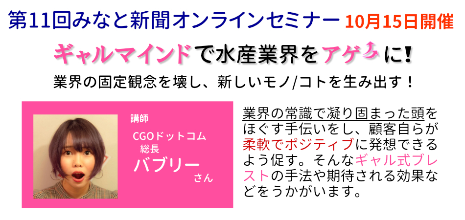 CGOドットコムは、そんな経営課題の解決を支援する活動を行っている会社です。講師として登壇いただくバブリーさん(会社代表)が開発したギャル式ブレスト(ブレインストーミング)というコミュニケーションツールを使い、「若者に刺さる事業や商品を考えたい」「意見の出ない会議を活性化したい」などのニーズに対応しています。