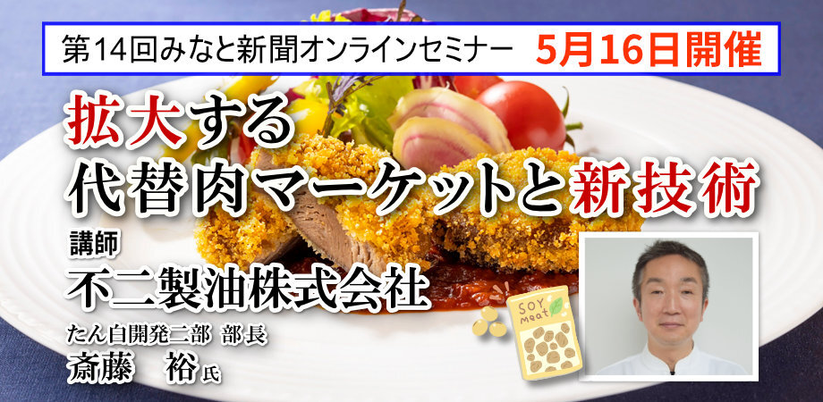 講演後にはみなと新聞本部長との対談を予定しており、代替シーフードの可能性や将来も取り上げる予定です。水産業界は天然魚の過剰漁獲や海水温上昇などに伴い、将来の供給に対する不安が広がっています。畜産業界においても、気候変動などに伴って肉を生産するコストが上昇するとの予測があります。おいしさと健康という切り口だけでなく、地球環境や世界の食料問題への貢献も期待される大豆ミートの可能性について、お話をいただきます。プラントベースシーフードの将来や可能性についても、ご意見をいただく予定です。