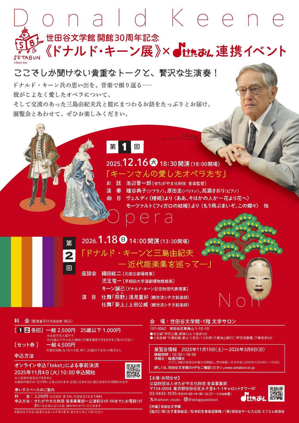 ドナルド・キーン氏の思い出を、音楽で振り返る――彼がこよなく愛したオペラについて、そして交流にあった三島由紀夫氏と能にまつわるお話をたっぷりとお届け。展覧会とあわせて、ぜひお楽しみください。