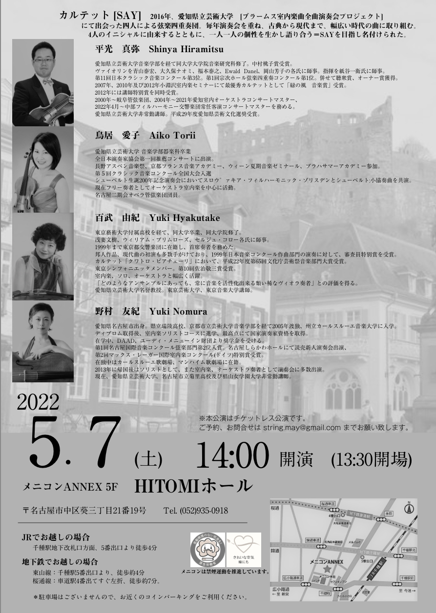 平光真弥(Vn)、鳥居愛子(Vn)、百武由紀(Vla)、野村友紀(vc)