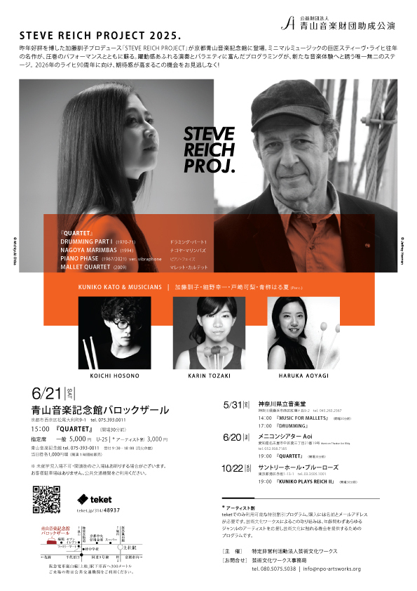 昨年好評を博した加藤訓子プロデュース「STEVE REICH PROJECT」が、京都青山音楽記念館に登場。ミニマルミュージックの巨匠スティーヴ・ライヒ往年の名作が、圧巻のパフォーマンスとともに蘇る。デュオ~カルテット作品を中核に、躍動感あふれる演奏による新たな音楽体験へと誘う唯一無二のステージ。2026年のライヒ90周年に向け、期待感が高まるこの機会をお見逃しなく!