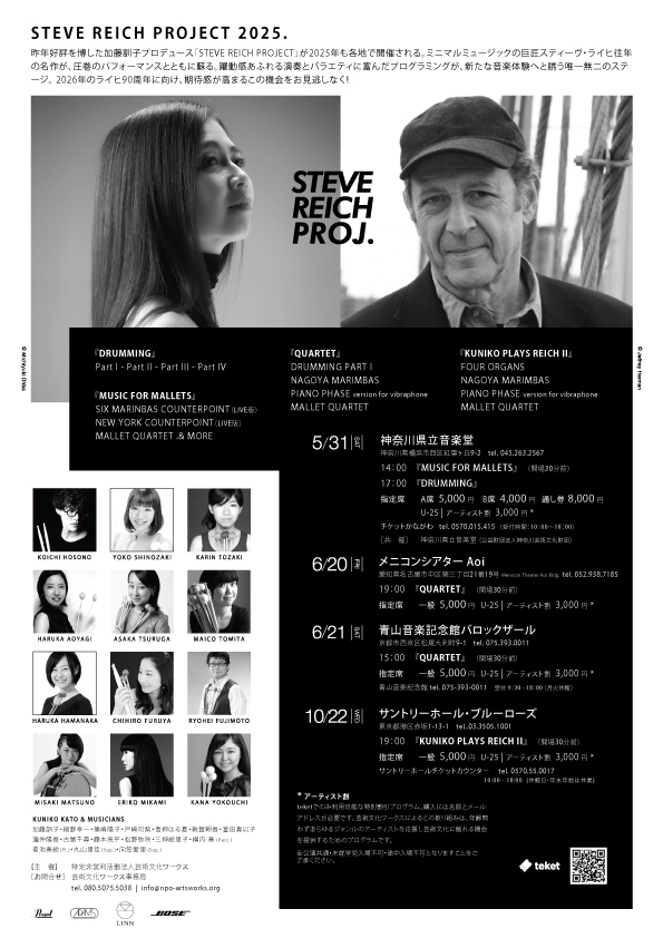 昨年好評を博した加藤訓子プロデュース「STEVE REICH PROJECT」が、メニコンシアターに登場。ミニマルミュージックの巨匠スティーヴ・ライヒ往年の名作が、圧巻のパフォーマンスとともに蘇る。デュオ~カルテット作品を中核に、躍動感あふれる演奏による新たな音楽体験へと誘う唯一無二のステージ。2026年のライヒ90周年に向け、期待感が高まるこの機会をお見逃しなく!