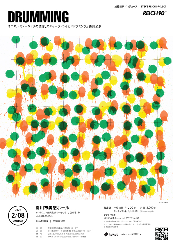昨年各地で好評を博した加藤訓子プロデュース「STEVE REICH PROJECT」が掛川にやってくる。ミニマルミュージックの巨匠スティーヴ・ライヒ往年 の 名 作 が 、圧 巻 の パ フ ォ ー マ ン ス と と も に 蘇 る 。 躍 動 感 あ ふ れ る 演 奏 と リ ズ ム が 、新 た な 音 楽 体 験 へ と 誘 う 唯 一 無 二 の ス テ ー ジ 。