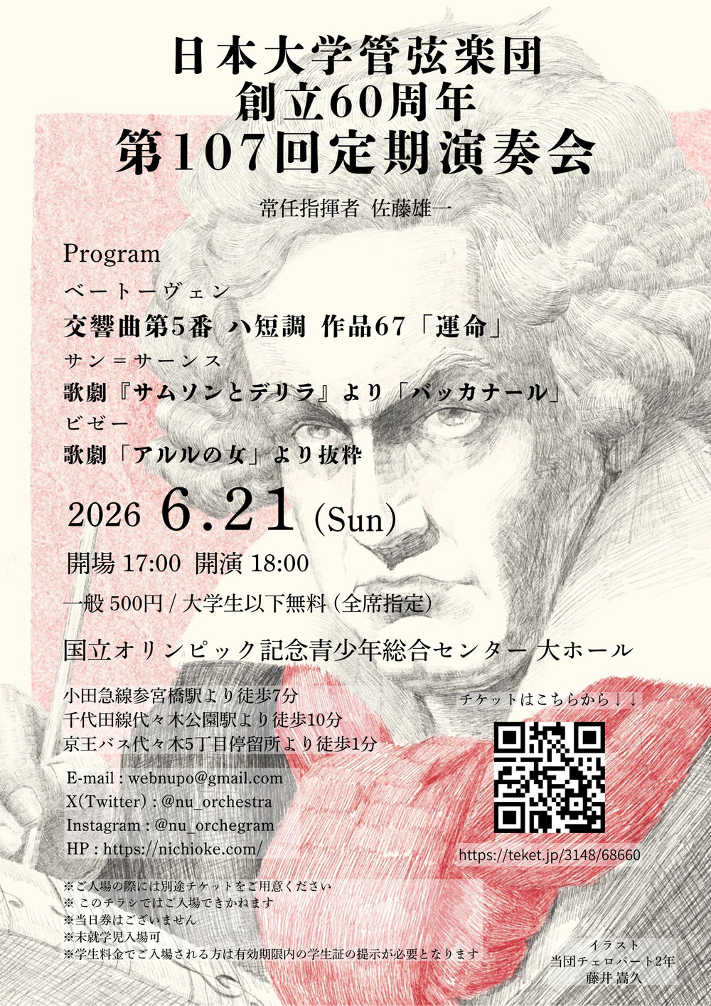 日本大学管弦楽団は今年で創立60周年を迎え、節目の年にふさわしい華やかで聴きごたえのあるプログラムをお届けします。
