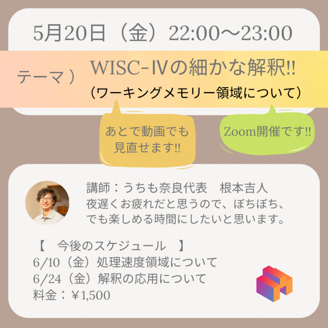 当日は1時間、ワーキングメモリー領域についてのお話もしますが、解釈の際はこれまで配信した”言語理解領域”や”知覚推理領域”とも併せて解釈してみる例題にもチャレンジしてもらおうと思います。(誰かに発言等してもらうことはありません。ご自身で一度考える楽しさを体験してみてください。)