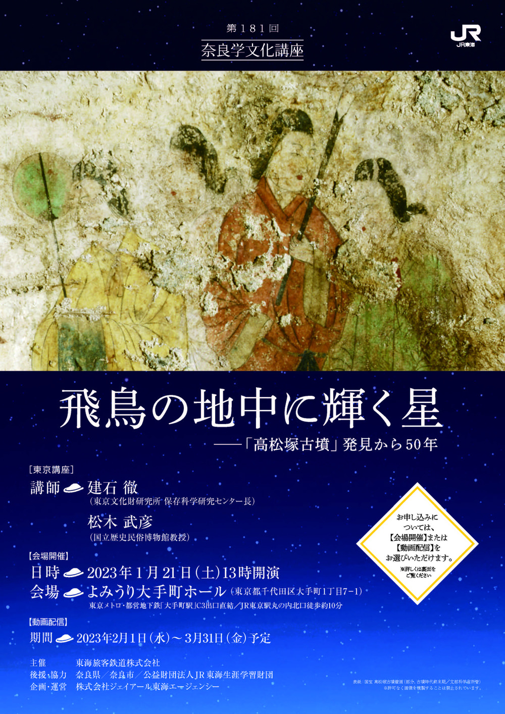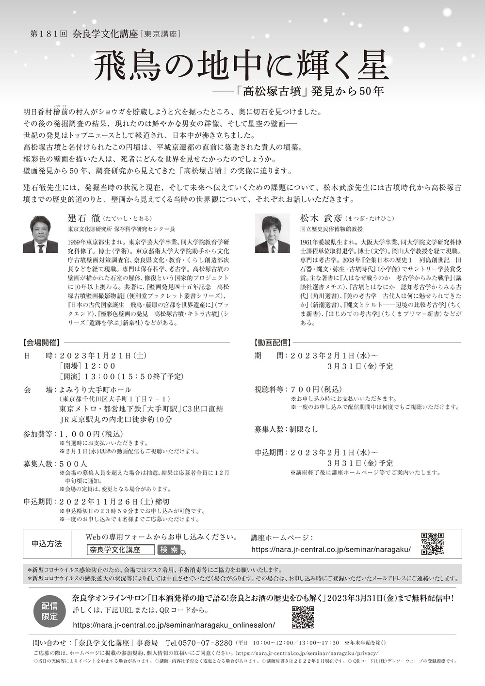 建石徹先生には、発掘当時の状況と現在、そして未来へ伝えていくための課題について、松木武彦先生には古墳時代から高松塚古墳までの歴史的道のりと、壁画から見えてくる当時の世界観について、それぞれお話しいただきます。