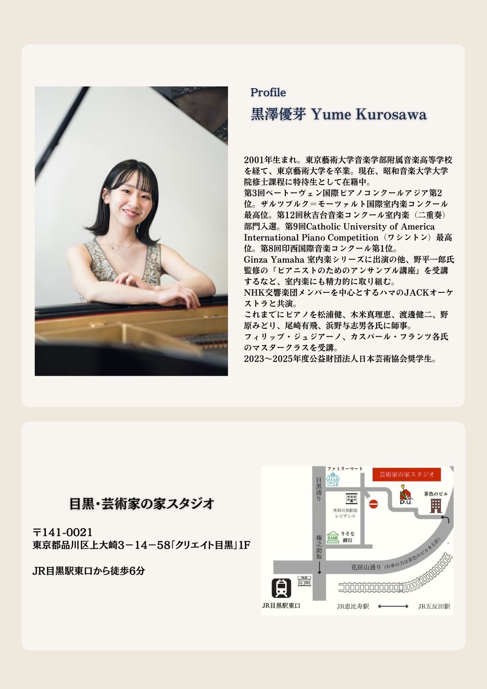 これまでにピアノを松浦健、木米真理恵、渡邊健二、野原みどり、尾崎有飛、浜野与志男各氏に師事。フィリップ・ジュジアーノ、カスパール・フランツ各氏のマスタークラスを受講。2023~2025年度公益財団法人日本芸術協会奨学生。