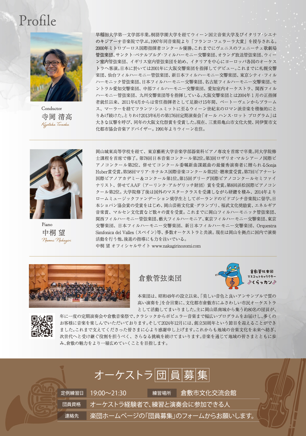 また、ラフマニノフの『パガニーニの主題による狂詩曲』では、岡山市出身のピアニスト中桐望氏をお迎えします。透明感と輝きのある音色、そして情感豊かな表現で定評のある中桐氏と、倉敷管弦楽団との共演が生み出すドラマチックな音楽の世界をご堪能ください。
