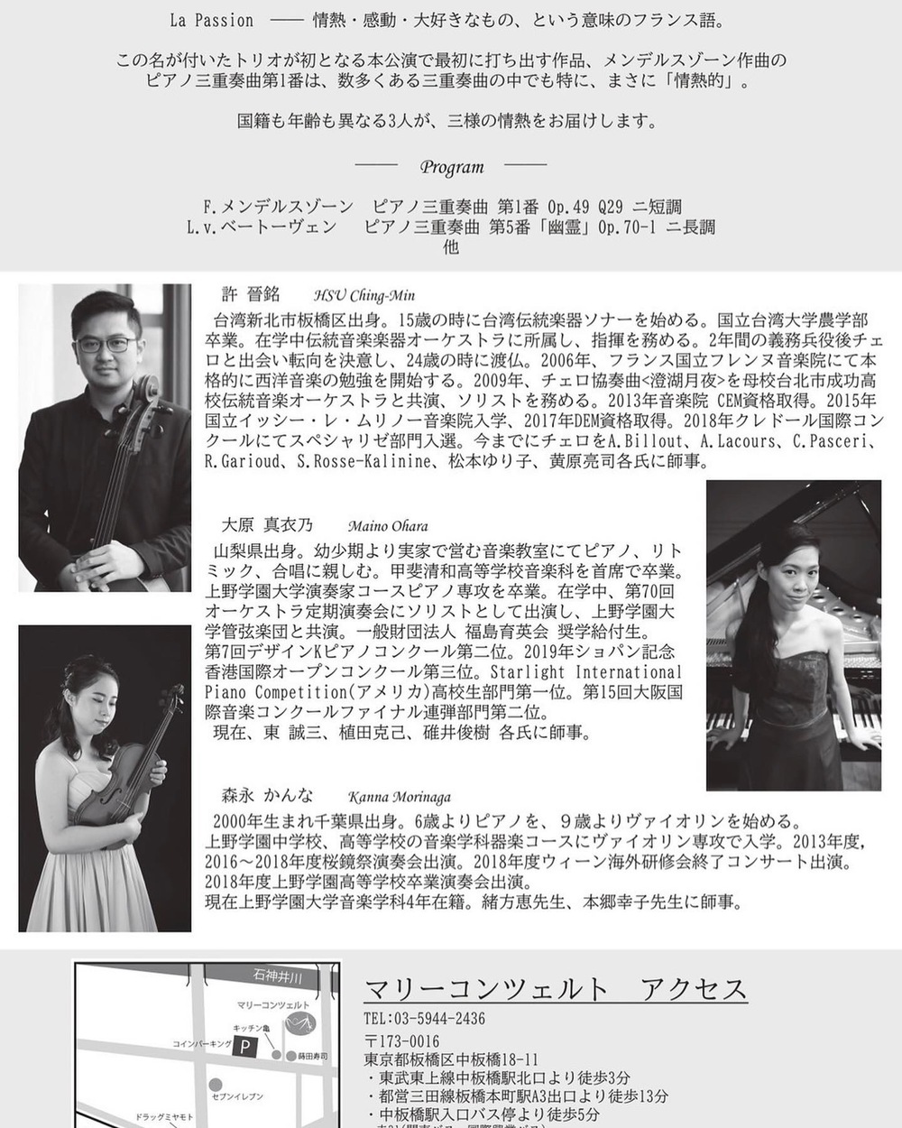 新進気鋭のTrio la passionによる、正統派クラシックプログラム!音楽に対する真摯な「情熱」を持った3人による、ピアノ・ヴァイオリン・チェロが織りなす美しい調べをお楽しみください。