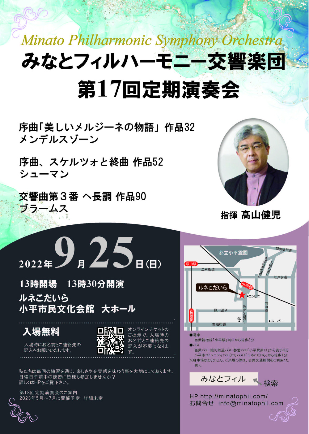 みなとフィルハーモニー交響楽団は2011年2月に発足した、東京都港区 江東区 江戸川区を中心に活動する市民オーケストラです。 第21回定期演奏会チケットに関するお問い合わせ:minatophil.teket@gmail.com その他のお問い合わせ:info@minatophil.com
