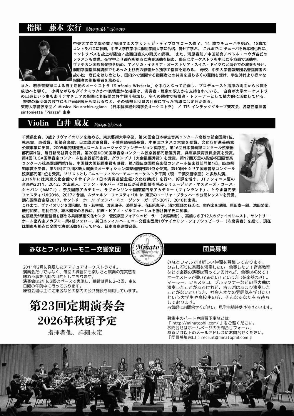 今回のみなとフィルハーモニー交響楽団の演奏会は、指揮に藤本宏行氏を初めてお迎えします。研ぎ澄まされたタクトが当団とどのような新たな化学反応を起こすのか、ご期待ください。