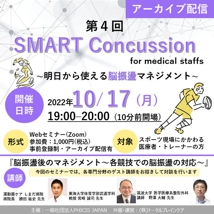 本チケットは2022年10月17日(月)に開催されたセミナー、『第4回 SMART Concussion for medical staffs ~明日から使える脳振盪マネジメント~』のアーカイブ動画となります。