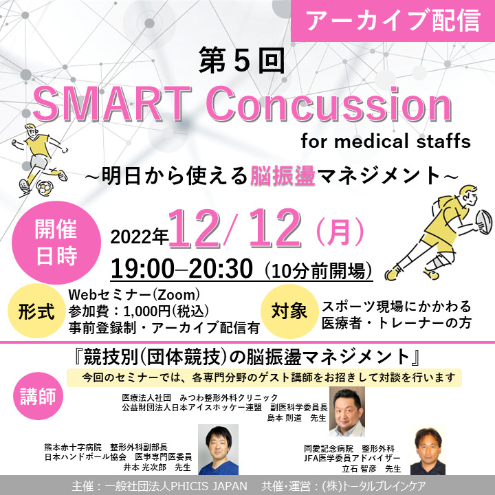 本チケットは2022年12月12日(月)に開催されたセミナー、『第5回 SMART Concussion for medical staffs ~明日から使える脳振盪マネジメント~』のアーカイブ動画となります。