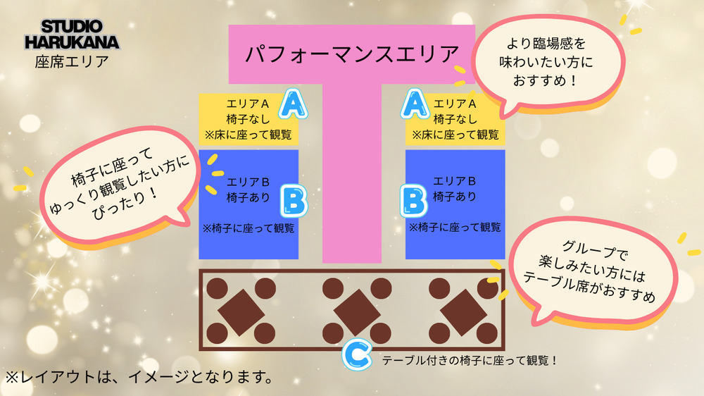 床に座っての観覧となります。ダンサーと近い距離で、より臨場感を味わいたい方におすすめ☆