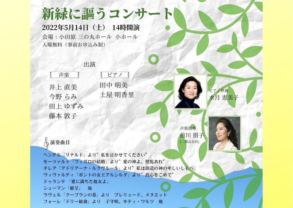 全国各地のオンライン声楽レッスン生が小田原に集合!日頃の成果を発表します。ピアノソロ・連弾や、講師による演奏も有り。