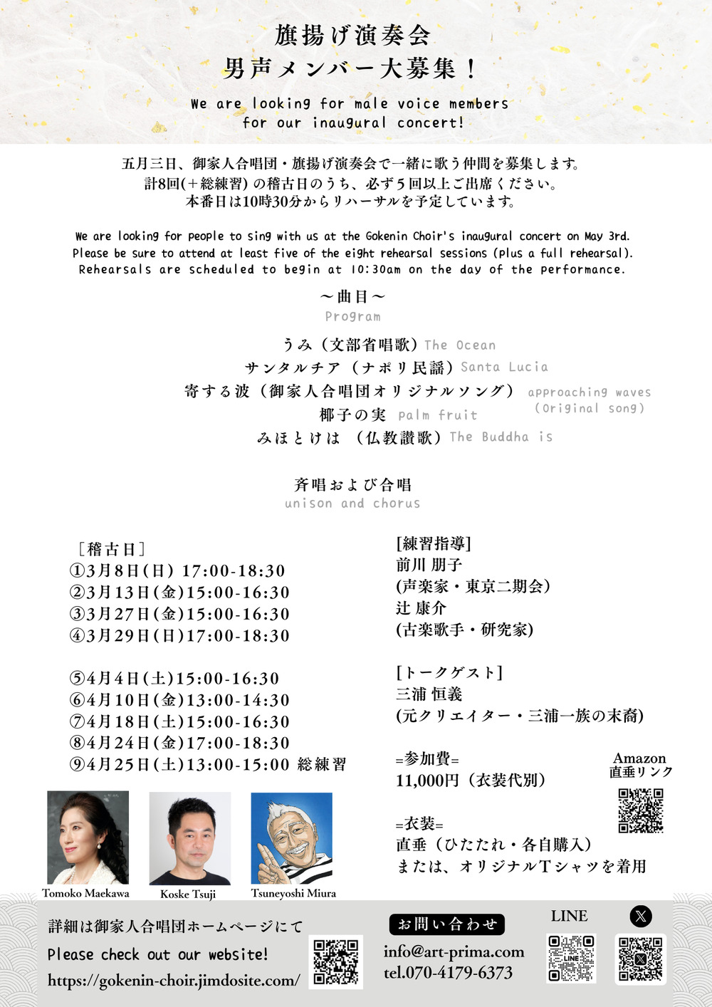 今回、共に舞台で歌うメンバーも募集しています。高校生からシニアまで大歓迎。お問い合わせはEメール、お電話で!