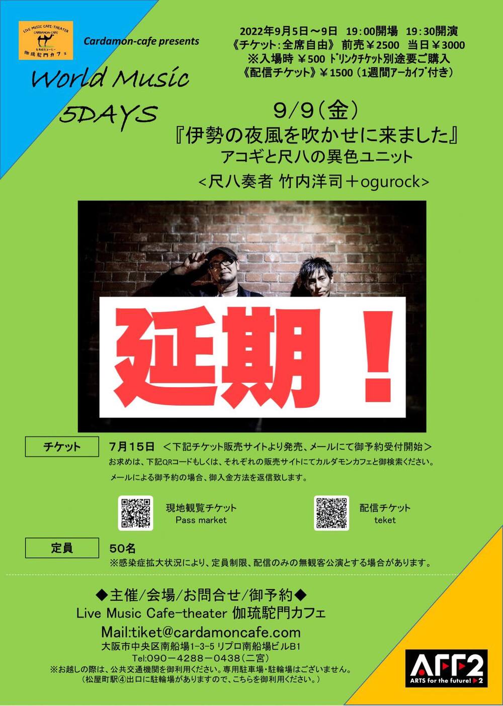 本日のライブ、Cardamon-cafe presents『World Music 5DAYS』9/9(金)『伊勢の夜風を吹かせに来ました』~アコギと尺八の異色ユニット~<尺八奏者 竹内洋司+ogurock>のチケット御購入・御予約いただいております方々へ緊急のお知らせです。
