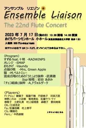 フルートアンサンブルにオーボエ、ファゴット、コントラバス、パーカッションを加えた室内楽です。前半はJ-Popをアレンジ。武満徹作品は合唱曲をソプラノとフルートアンサンブルにアレンジしました。チェコ組曲はオーケストラ曲をリエゾン用にアレンジ。オリジナルとはまた違った空気感をお楽しみ頂けます。乳幼児のお子様連れも歓迎です。ぜひご来場ください。