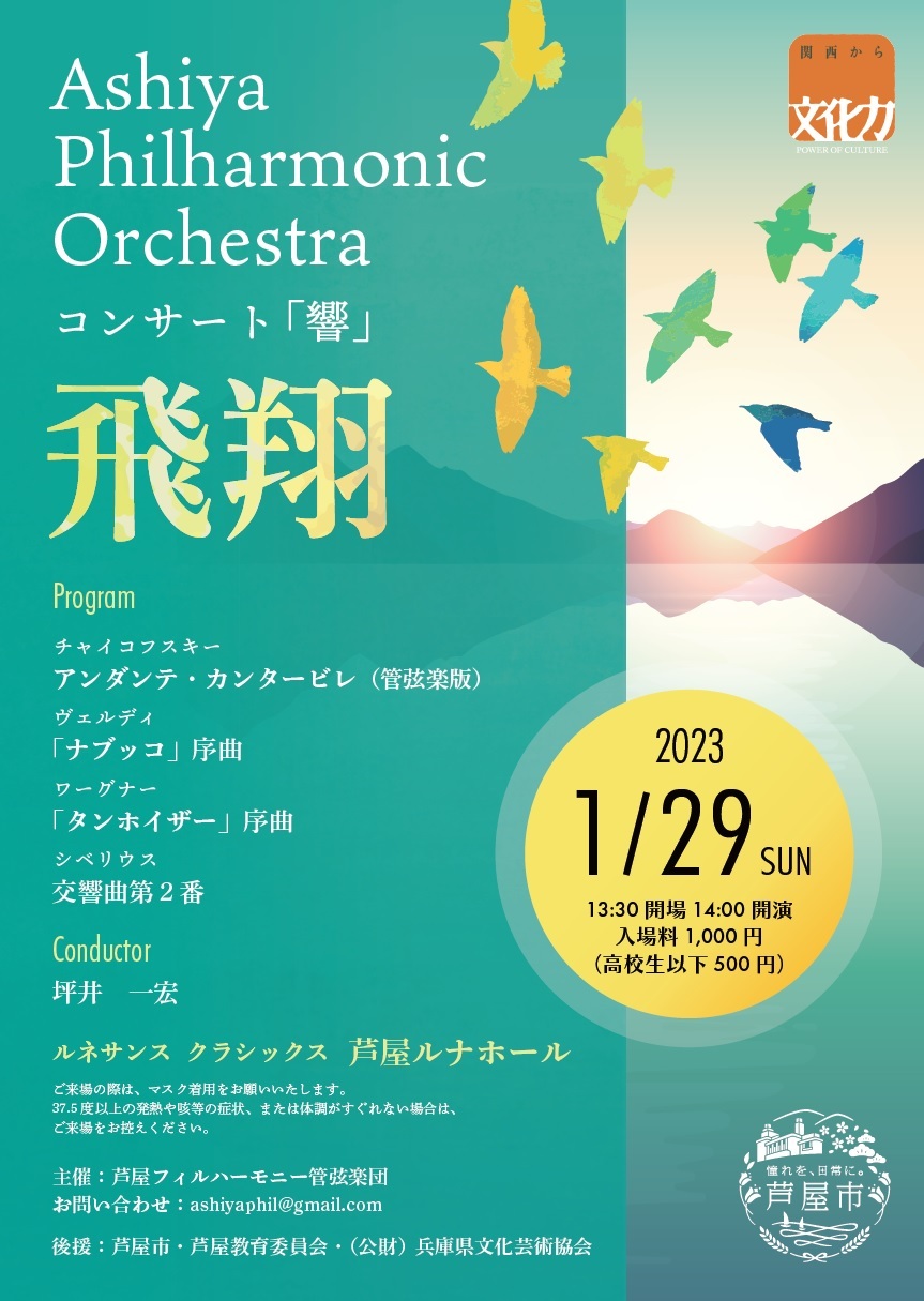 芦屋フィルハーモニー管弦楽団は、1999年設立のアマチュアオーケストラです。2019年10月に新生芦屋フィルとして再結成しましたが、コロナ感染拡大のために活動は中止を余儀なくされましたが、コロナ禍でも演奏活動が持続できるようにアンサンブル発表会から小編成のオケ、フル編成のオケとステップアップし、今回はその第5弾として締めくりのコンサート『響』”飛翔”を開催いたします。このコンセプトの”飛翔”は、ナブッコより『行け、わが想いよ、黄金の翼に乗って』より、通常のオーケストラ活動への飛び立ちを目指すものです。