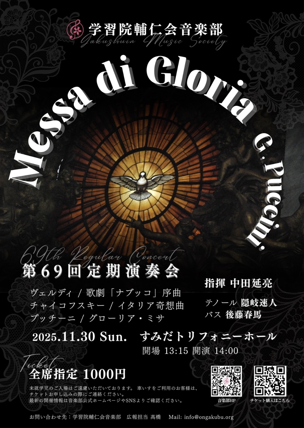 メイン曲のプッチーニ/グローリア・ミサではソリストをお招きし、合唱団と管弦楽団の共演と大変迫力のあるプログラムとなっております。