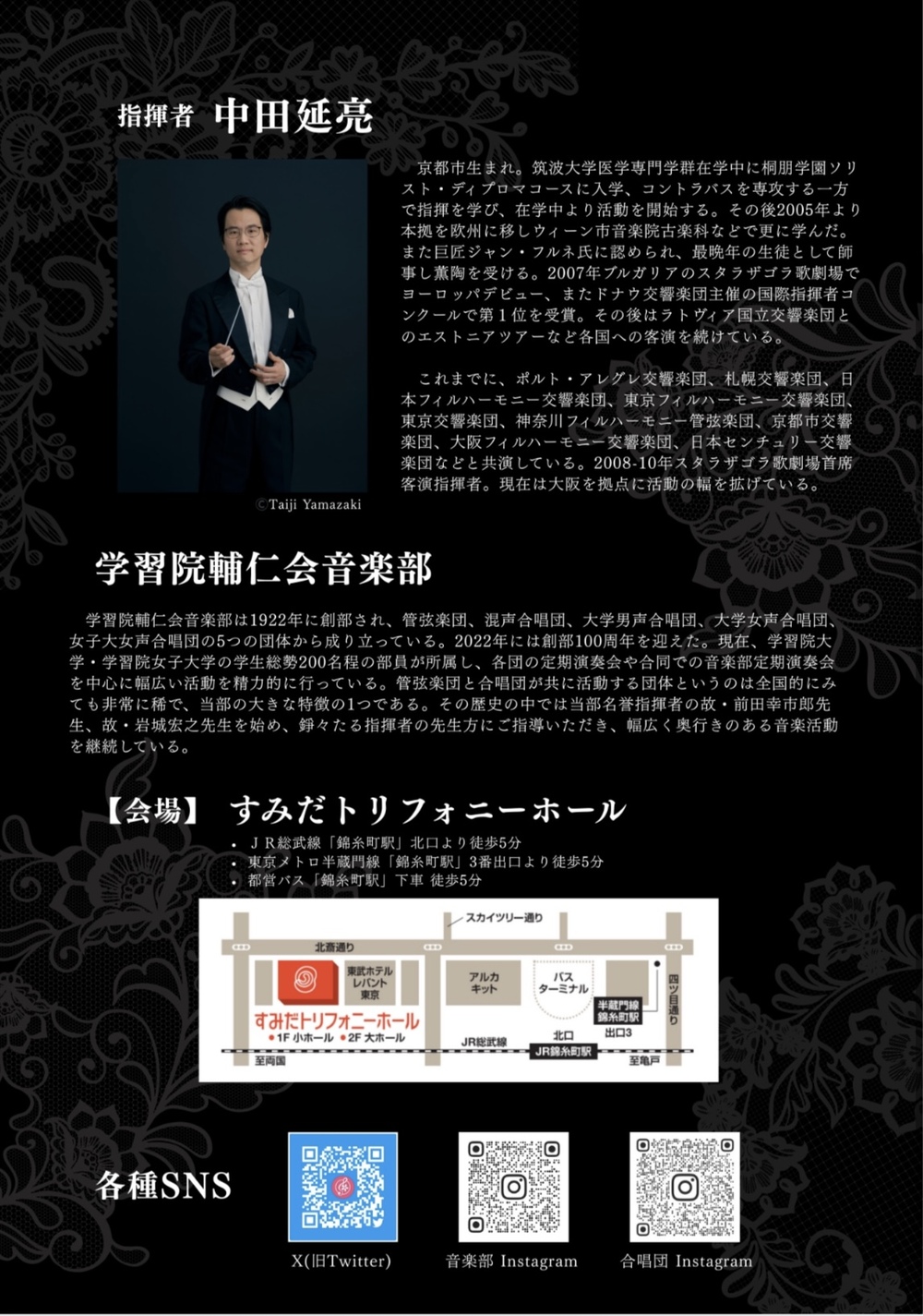 合唱団と管弦楽団で構成されており、学習院大学・学習院女子大学の学生170名が所属しています。