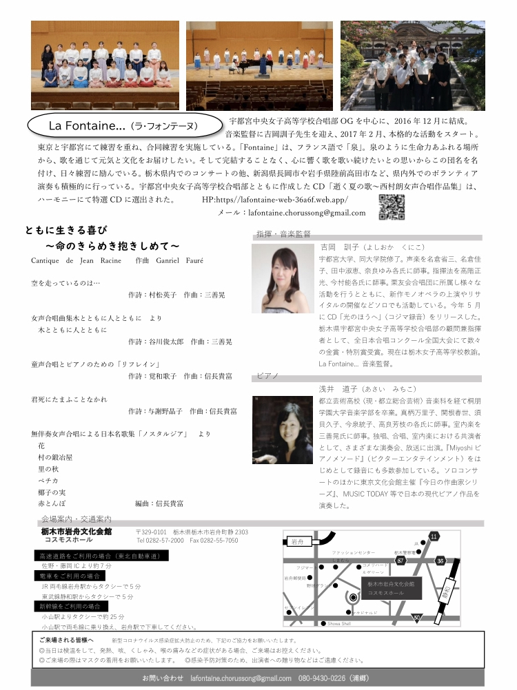 宇都宮中央女子高等学校合唱部OGを中心に、2016年12月に結成。音楽監督に吉岡訓子先生を迎え、2017年2月、本格的な活動をスタート。東京と宇都宮にて練習を重…