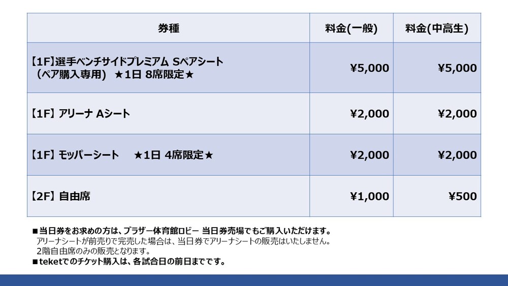 当日券をお求めの方は、ブラザー体育館に入場後、現金にてご購入ください。