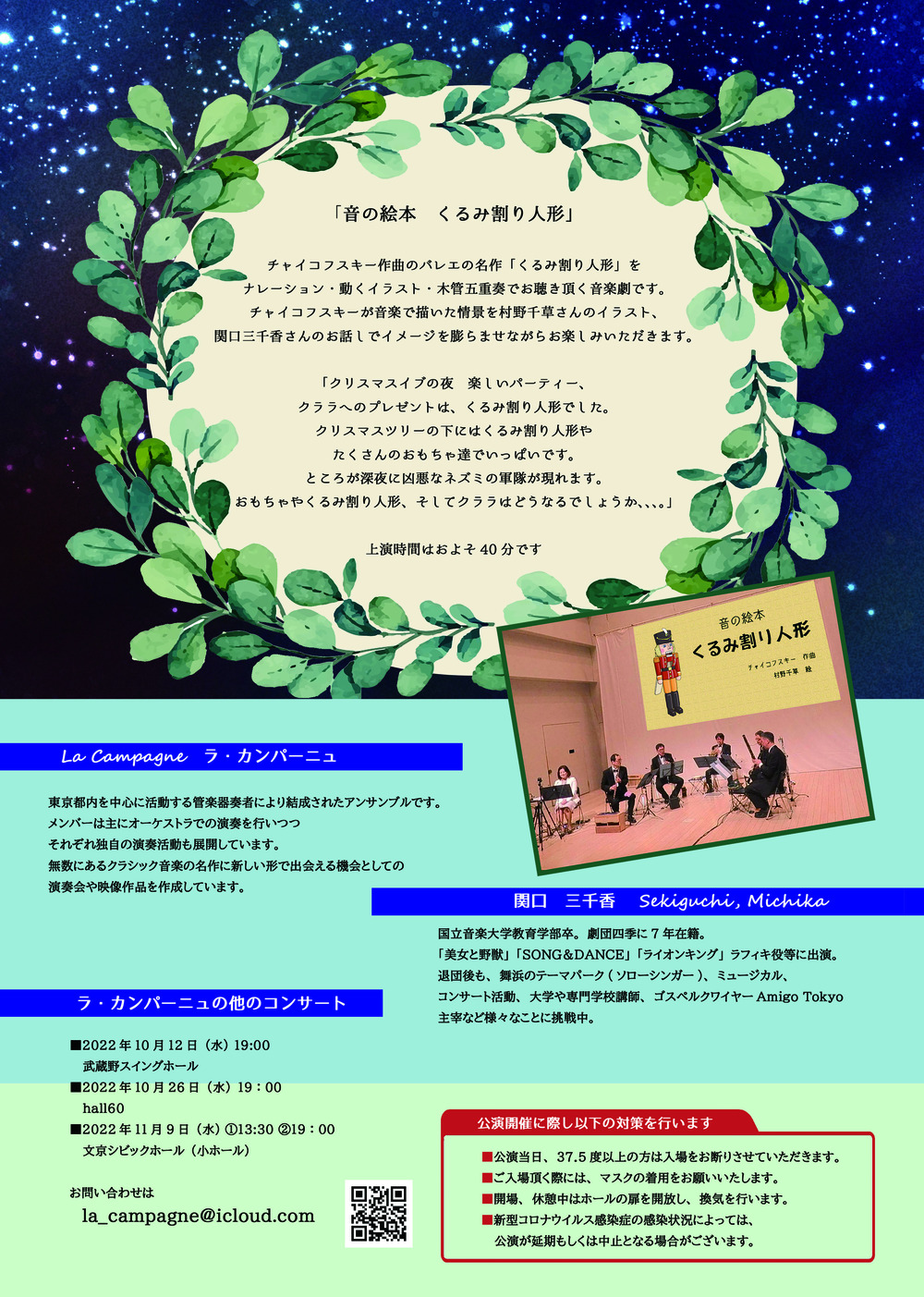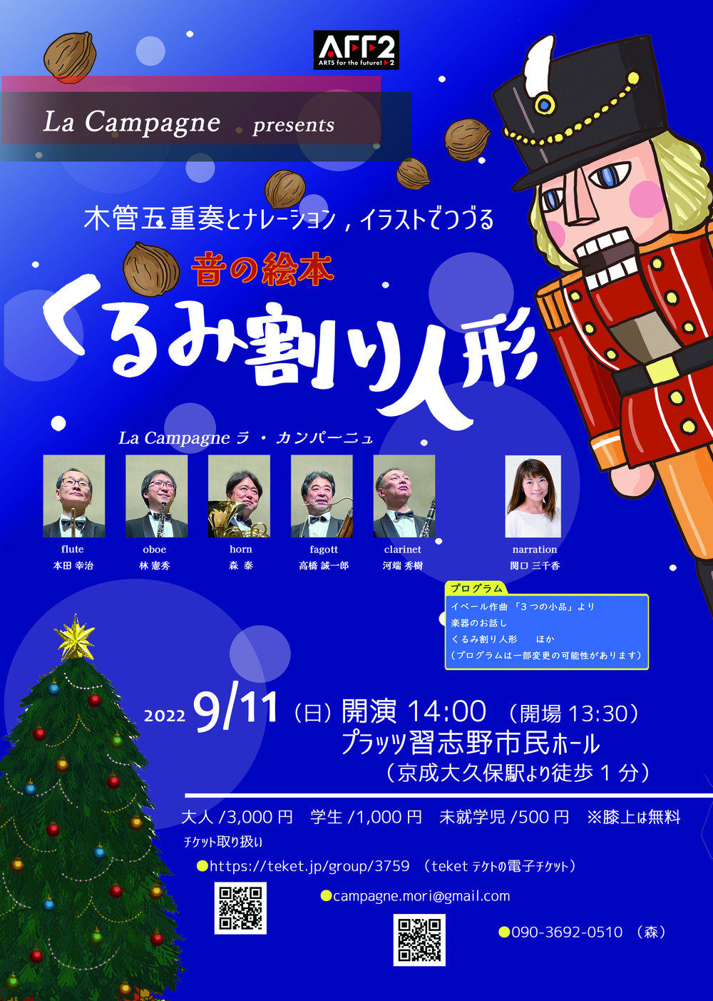 チャイコフスキー作曲のバレエの名作「くるみ割り人形」をナレーション・動くイラスト・木管五重奏でお聴き頂く音楽劇です。