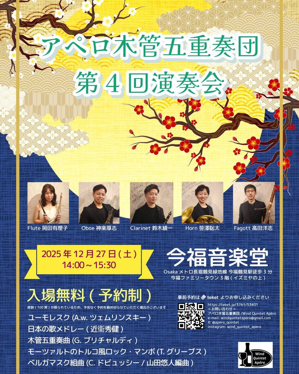 はじめまして!大阪を拠点に活動するアマチュアの木管5重奏団です♫ Apéro(アペロ)とはフランス語で食前酒や軽い飲み会を指します🥂日本だと「ちょい飲み、ゼロ…