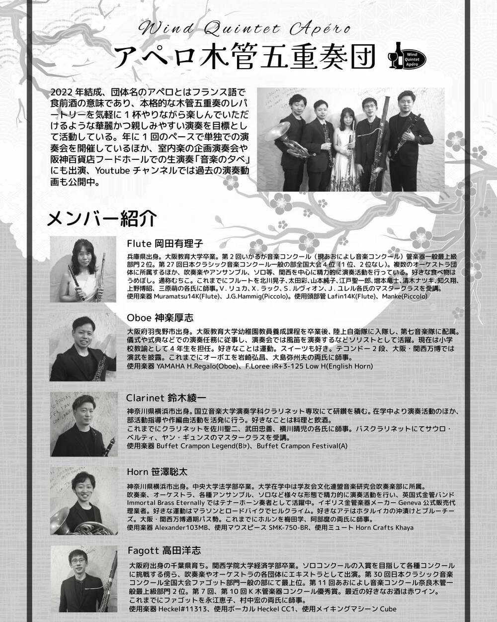 はじめまして!大阪を拠点に活動するアマチュアの木管5重奏団です♫ Apéro(アペロ)とはフランス語で食前酒や軽い飲み会を指します🥂日本だと「ちょい飲み、ゼロ次会、乾杯の練習」あたりになるでしょうか。 Fl岡田有理子、Ob神楽厚志、Cl鈴木綾一、Hr笹澤聡太、Fg高田洋志🥂