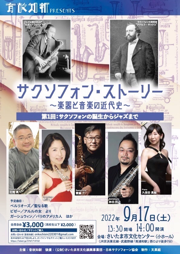 ロマン派音楽が登場してからおよそ200年。この間には印象主義や前衛音楽、国民楽派やジャズ、ロックといった新しい音楽が次々と登場し、またクラシック音楽の演奏会や蓄音器、ラジオやネット配信など音楽の聴き方も多種多様に変化しました。この音楽の急速な進化と常にシンクロしていたのが、1840年代に登場した新しい管楽器サクソフォンだったのです。「サクソフォン・ストーリー」は、この楽器の誕生から現代にいたる音楽の歩みを、その時代に製造されたサクソフォン(ピリオド楽器)だけが持つ「当時の音」で俯瞰しようというユニークな演奏会シリーズです。第1回となる本公演の前半は、サクソフォンの誕生した19世紀の後期ロマン派音楽をアドルフ・サックス自身の製作した楽器で演奏する「サクソフォンの誕生」。後半は、人類史上初めてのワールドヒット音楽「ジャズ」が成立するまでの音楽を20世紀初頭のアメリカンサックスで演奏する「ジャズ・エイジ」をお楽しみいただきます。