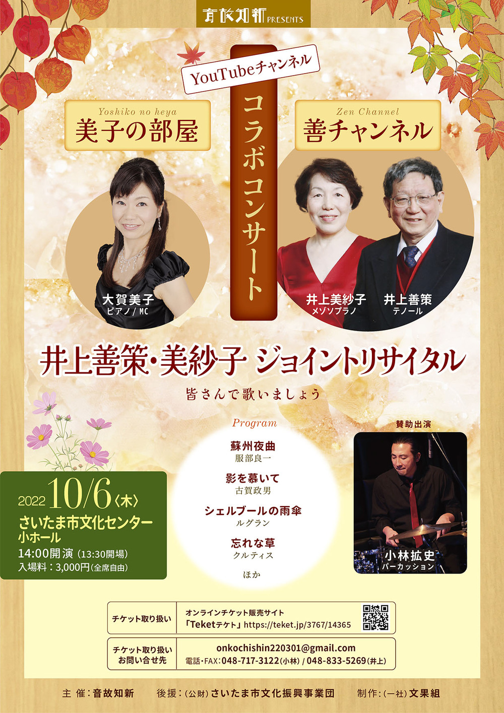 86歳の現役テノール歌手・井上善策と美紗子夫人によるYouTubeチャンネル「善チャンネル」と、ピアニスト・大賀美子のYouTubeチャンネル「美子の部屋」がコラボレーション!楽しいトークを交えながら、昭和歌謡やカンツォーネ、シャンソンなど、名曲の数々をお送りいたします。コンサートの後半は、「皆で歌いましょう」。会場の皆様にも季節の叙情歌や懐かしい歌謡曲を歌っていただくお時間です。毎週木曜日夜8時、BS 11で放送中の「八代亜紀いい歌いい話」にドラマーとしてレギュラー出演中の小林拡史も賛助出演し、皆さんの歌を盛り上げます。聴いて歌って思いきり名曲に浸る2時間。どうぞお楽しみください!
