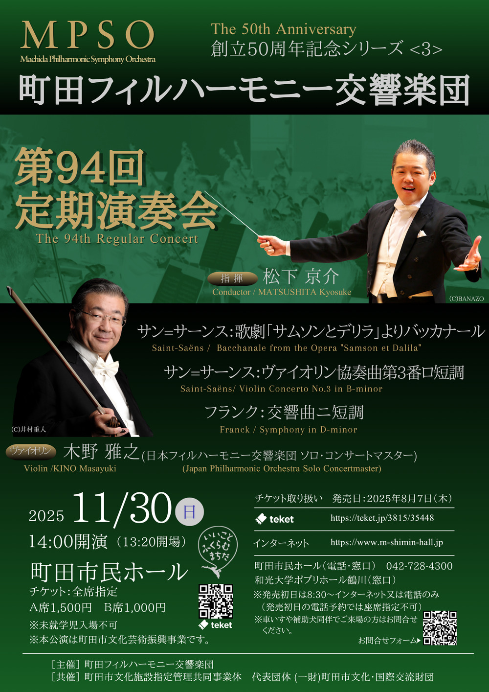指揮には、2018年以来7年ぶり2回目となる松下京介氏を、ヴァイオリン協奏曲のソリストには日本フィルハーモニー交響楽団 ソロ・コンサートマスター木野雅之氏をお迎えし、フランクの交響曲ニ短調やサン=サーンスのヴァイオリン協奏曲第3番ロ短調などをお届けします。