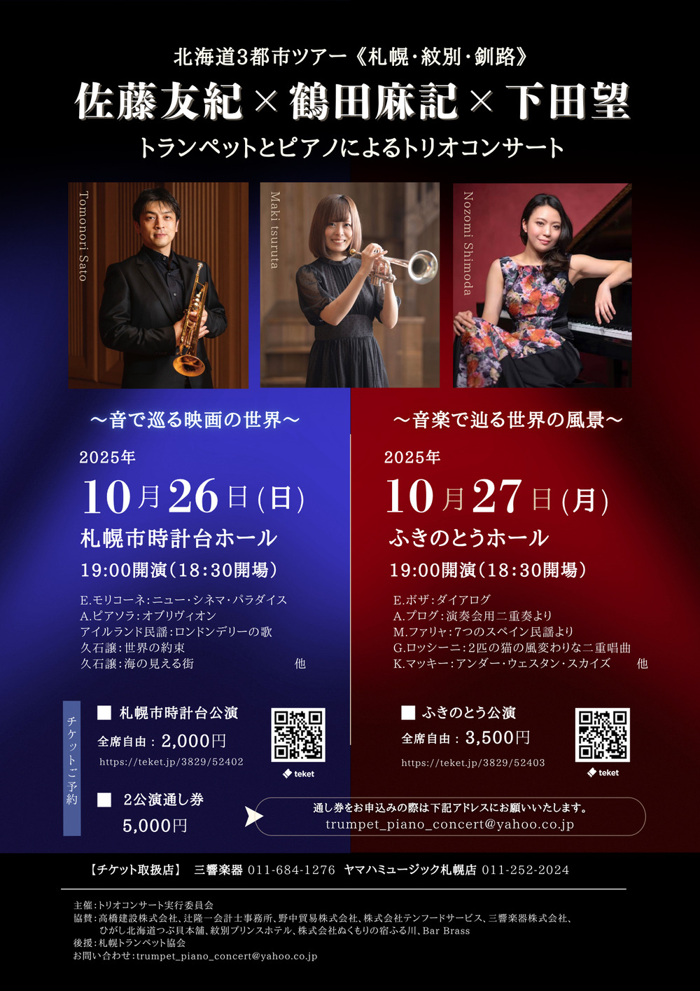日本を代表するトランペット奏者の佐藤友紀と、元札幌交響楽団副首席奏者鶴田麻記、アンサンブルピアニストとして長年2人とも共演を重ねてきた下田望で奏でるトリオコンサート。