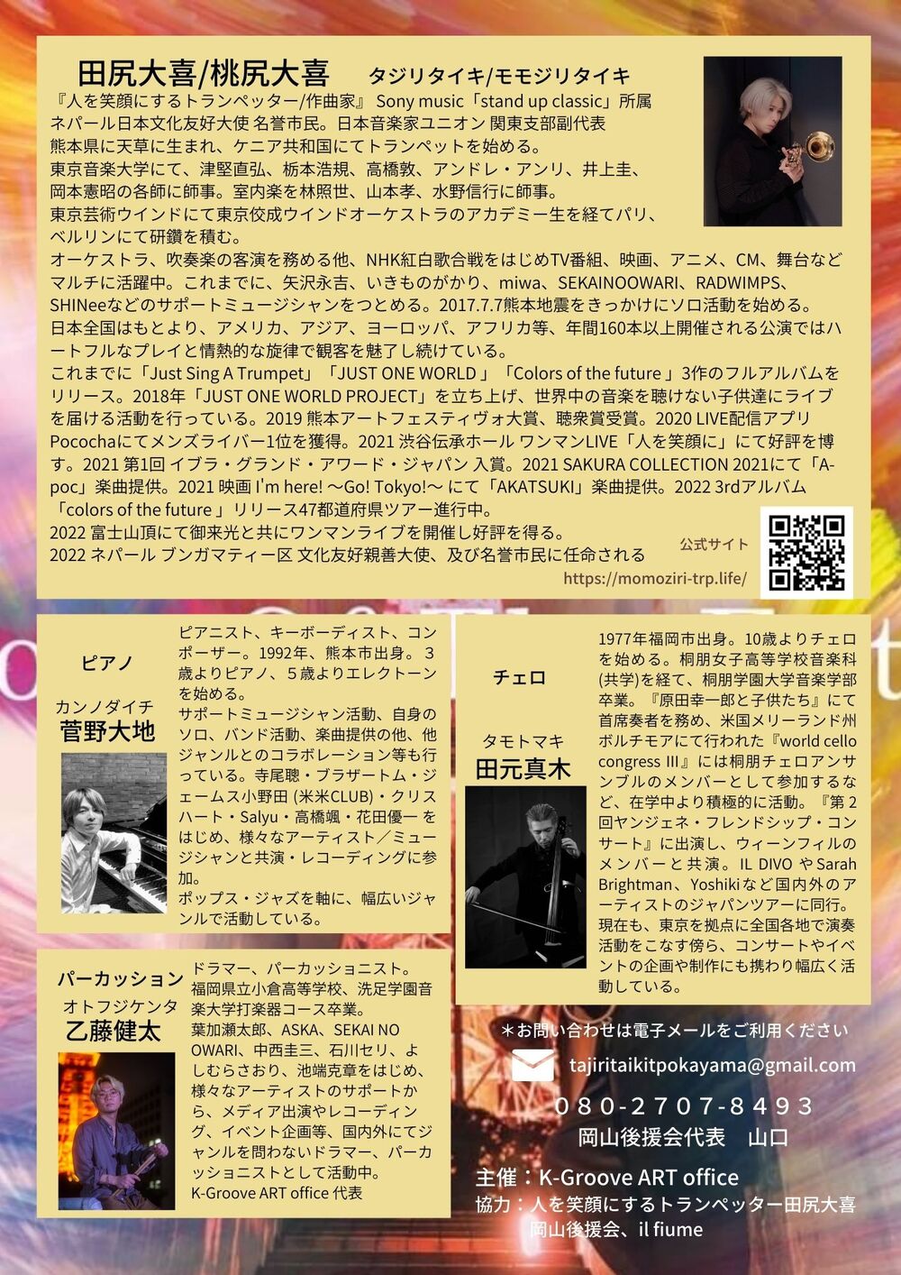 透明感のある美しい音色と圧倒的な表現力、心をゆさぶる素敵なメロディーのオリジナル曲で人を癒し人を笑顔にするトランぺッター田尻大喜。