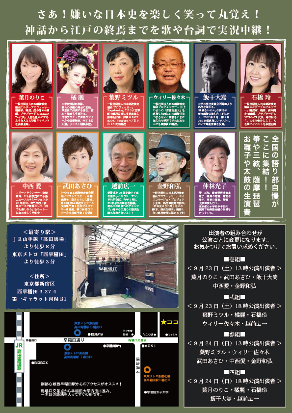 全国の語り部自慢が各会場に集結!BPM120という速度で、神話から江戸幕末までをタイムスリップしながら、実況中継をするという何ともはや抱腹絶倒、前代未聞のトーキングショー!!