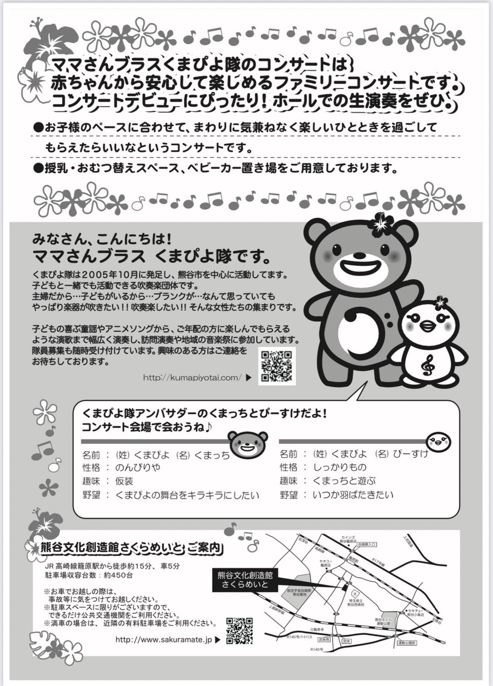 埼玉県熊谷市のママさんブラスバンドです。 活動は月に3回、平日の午前2回と土曜日1回です。曲は子供の喜ぶ童謡やアニメソングからご年配の方に楽しんでもらえる様な演歌まで幅広く演奏しています。各パート隊員随時募集中! 《演奏依頼について》 演奏依頼をご検討の場合は早めにお問合せください。 詳しくは http://kumapiyotai.com/ をご覧ください。