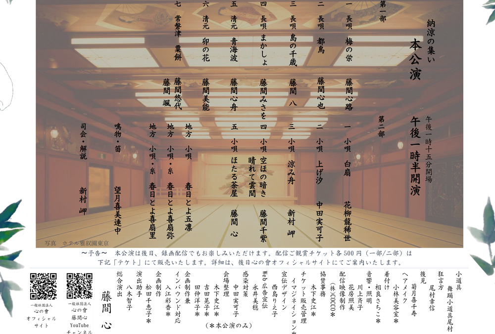 尚、本公演が後日録画配信でもお楽しみいただけます。配信ご鑑賞チケット各500円(一部/二部)は本サイトteketにて販売いたします。詳細は後日心の會オフィシャルサイトにてご案内いたします。